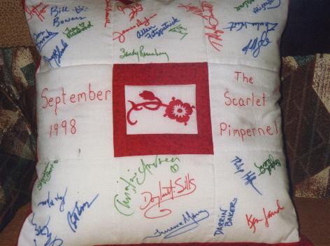 Kelly and I collected autographs from cast members and I sewed this friendship pillow, which was auctioned by Lynne (Kirby Hall) on the TPC website in September, 1998. It sold for an astonishing $1,050. Here is a picture of Douglas and me with the pillow at the Broadway Flea Market, September, 1998.