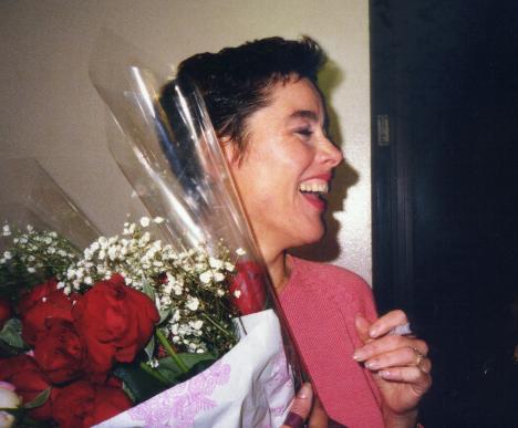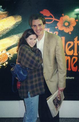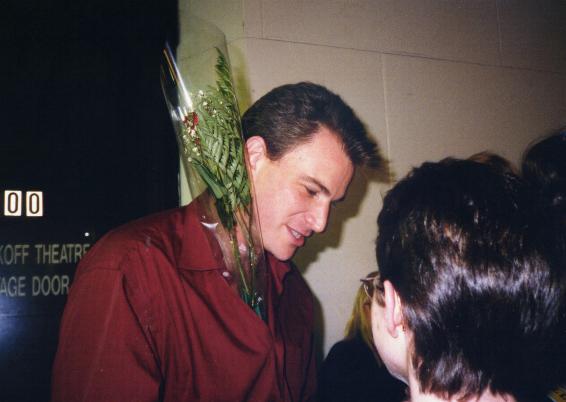 On October 1, 1998, The Scarlet Pimpernel closed in order to rehearse a new version of the show, which would open October 10, 1998. In this picture, Douglas finds a novel way to hold his flowers and sign autographs at the same time. This is my favorite picture of Christine Andreas.
