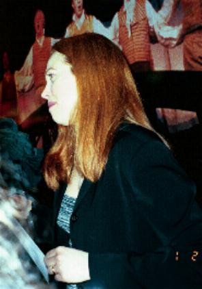 In a visit backstage on December 29, 1999, Kelly was encouraged to hold Ron's severed head. Shortly before that, on November 21, 1999, we celebrated the second anniversary of The Scarlet Pimpernel at Barrymore's Restaurant. Ron Bohmer, Marc Kudisch, Harvey Evans, Jim Hindman and Kirk McDonald spent some time with us that day.